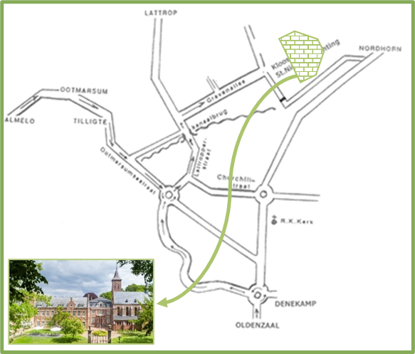 In Denekamp op de eerste rotonde de derde afslag nemen en de weg volgen tot aan de volgende rotonde. Daar de tweede afslag rechts nemen richting Lattropperstraat en de weg verder volgen. Over de kanaalbrug, na 100 meter, rechtsaf slaan (bij bord St. Nicolaasstichting); dit is de Gravenallee en op het einde van de laan, links, zie je direct het nieuwe Franciscushuis.
